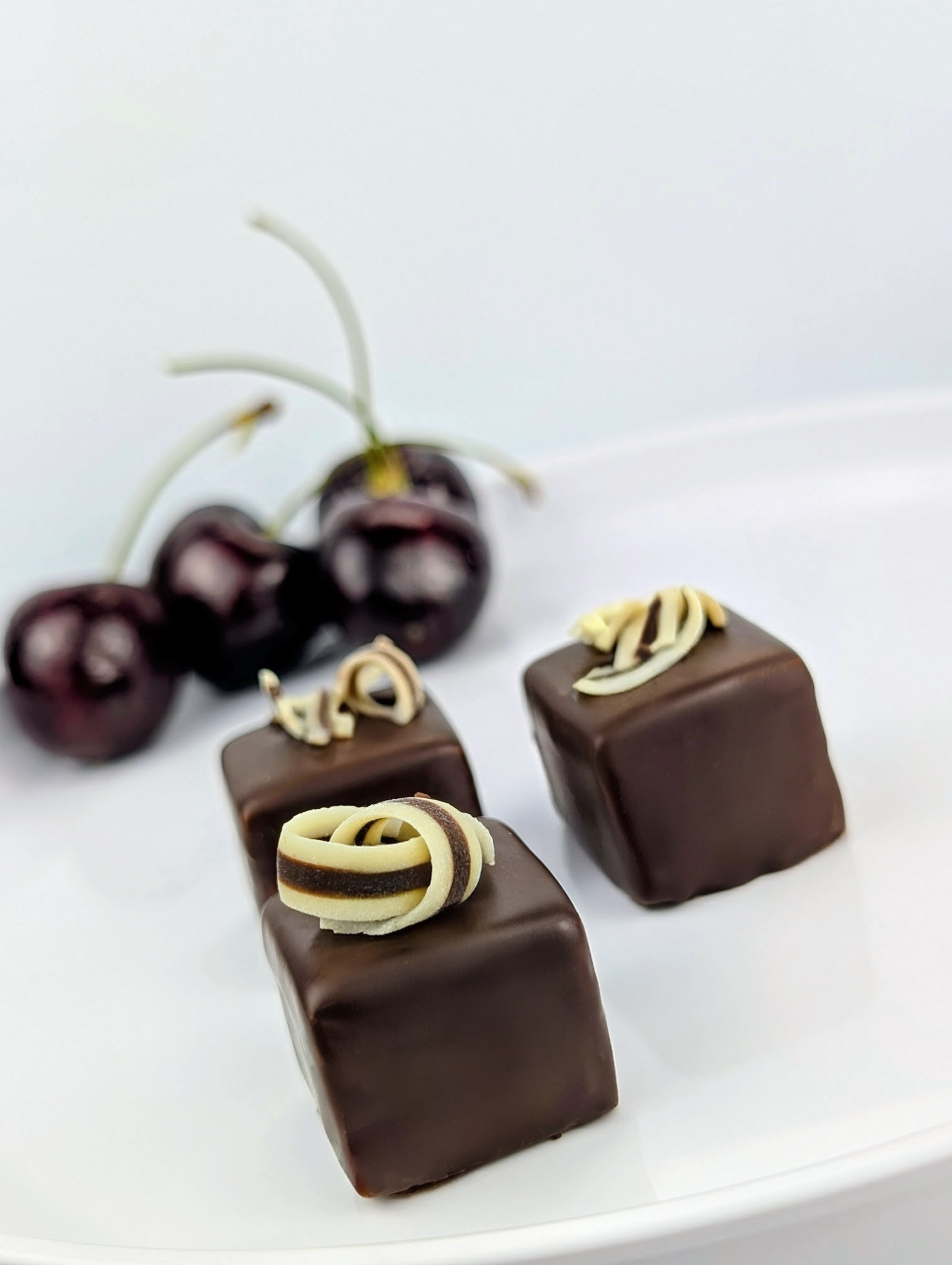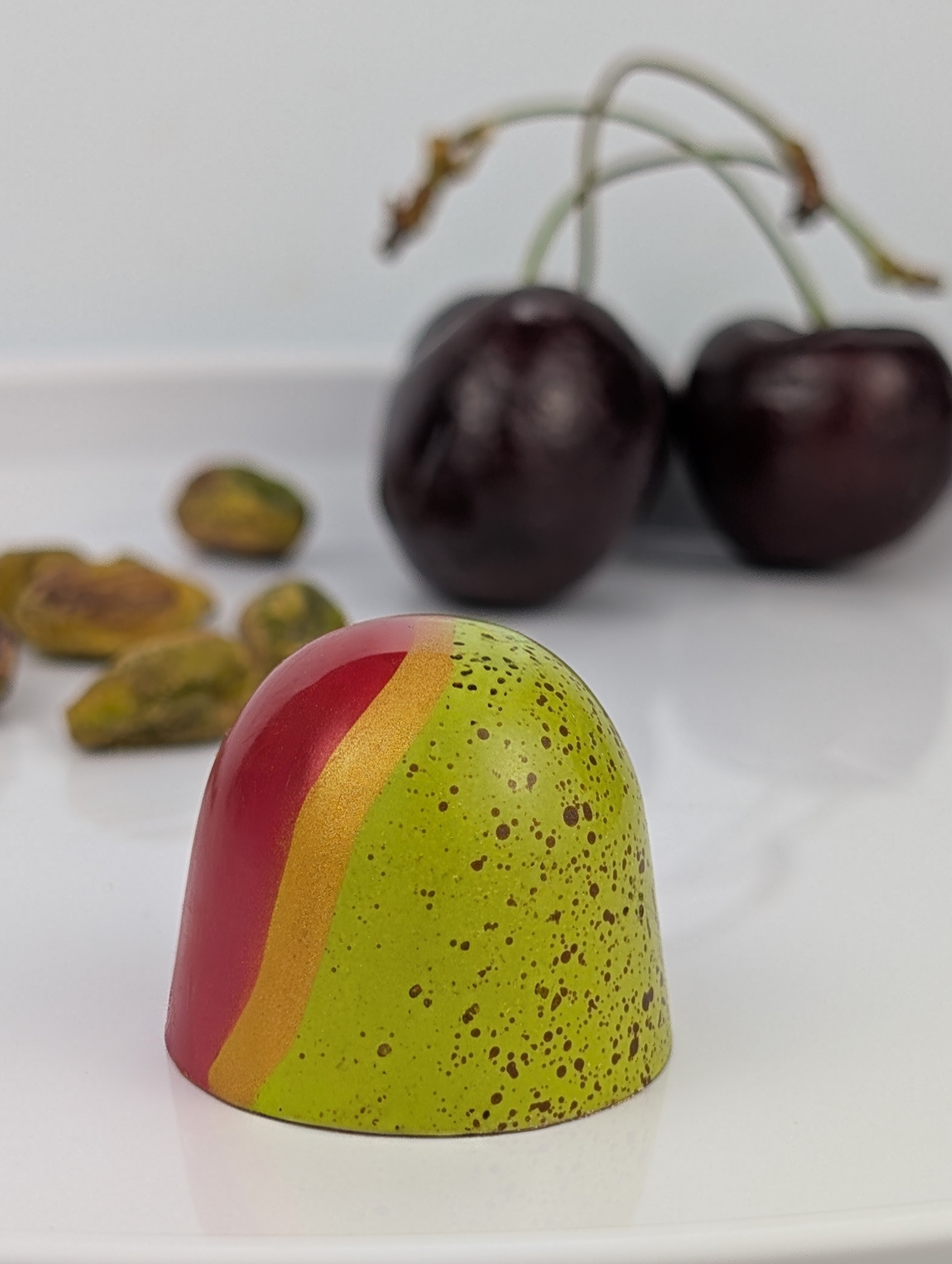 Black Forest is the quiet powerhouse of the collection—elegant and precise. Silky dark chocolate forms the foundation, carrying a tart cherry pâte de fruit, and topped with a smooth vanilla white chocolate layer. This bonbon excels in balance: bright acidity, deep cocoa notes, and creamy sweetness working in perfect harmony